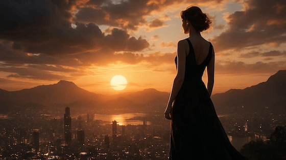 At golden hour, a brick tenement rooftop transforms into a small stage. Laundry lines strung with white sheets sway in the wind, catching the last rays of sunlight. Strings of mismatched fairy bulbs hum faintly overhead. A young woman in a flowing red silk dress dances barefoot, curls glowing in the fading light. Her partner — sleeves rolled, suspenders loose — claps along, his smile wide and unguarded. Below, the city hums with car horns, subway tremors, and distant laughter.